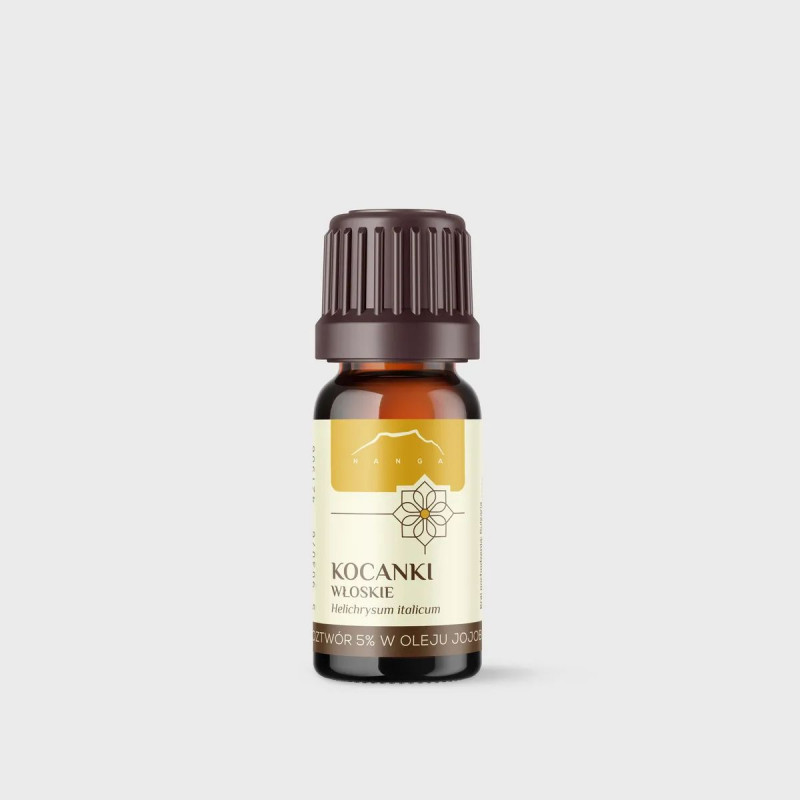 Es ist die wohltuende und mehrstufige Wirkung auf die Haut, die in den Vordergrund tritt. Nicht umsonst ist Helichrysumöl Bestandteil vieler exklusiver Gesichtspflegeprodukte mit verjüngenden Eigenschaften; Es hat die Fähigkeit, die Elastizität der Haut zu verbessern (indem es die Aktivität der Kollagenase- und Elastase-Enzyme hemmt, die für den Abbau von Kollagen und Elastin verantwortlich sind) sowie Falten und Narben zu reduzieren. Helichrysumöl wirkt aber nicht nur verjüngend, sondern ist auch eine unschätzbare Hilfe bei der Behandlung von Hautentzündungen (z.B. Akne, Schuppenflechte, Ekzeme oder Mykosen).