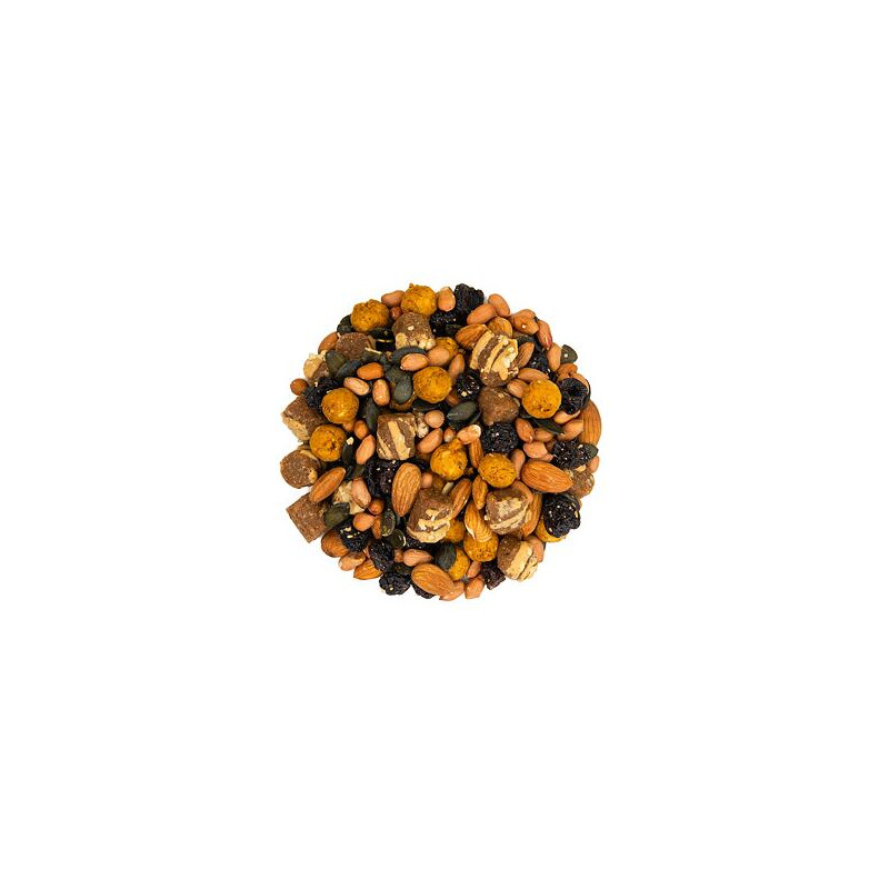 Mischung aus getrockneten Früchten, Samen und Nüssen, Glutenfrei, -, Zutaten: Erdnüsse, Kürbis, Mandeln, Mango, Kirsche, Verpackung: wiederverschließbarer ZIP-Beutel