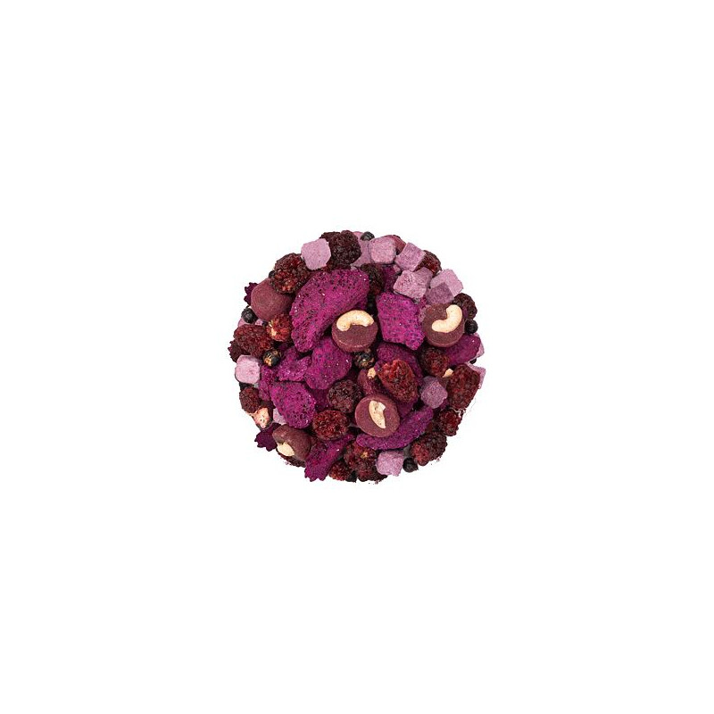 Laktosefrei, Glutenfrei, RAW, Vegan, -, Zutaten: Heidelbeere, Drachenfrucht, Cashewkerne, Kokosnuss, Brombeere, Verpackung: wiederverschließbarer Reißverschlussbeutel