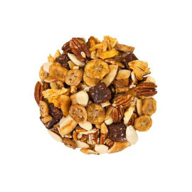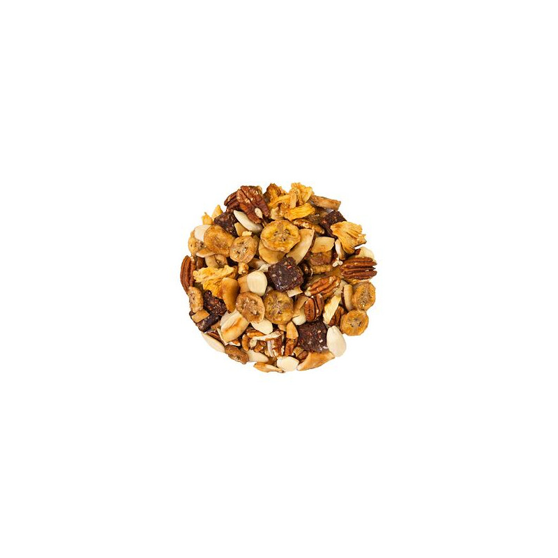 Nuss & Frucht Mischung, laktosefrei, glutenfrei, vegan, -, Zutaten: Ananas, Banane, Kokos, Himbeere, Mandeln, Pekannüsse, Verpackung: wiederverschließbarer ZIPPER-Beutel